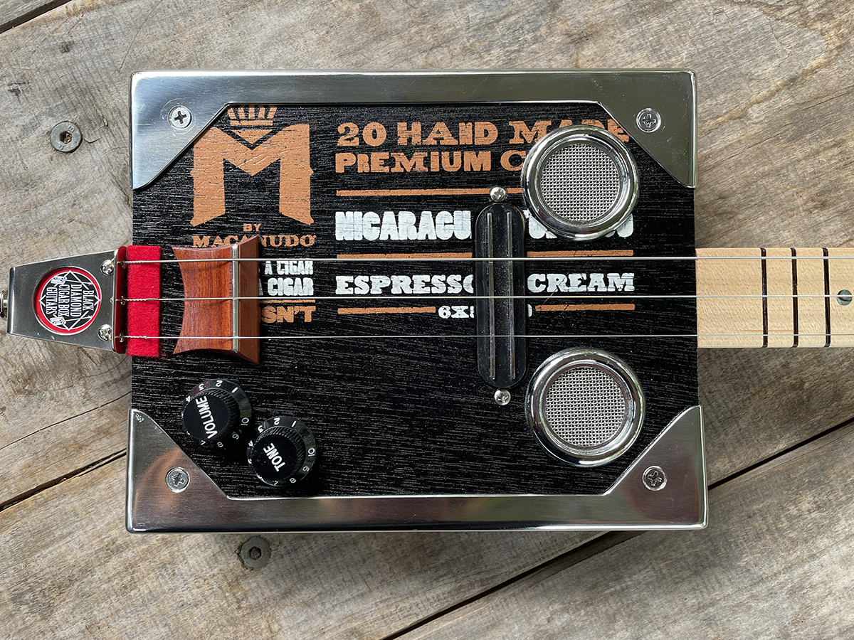 The sounds which resonate from these magnificent musical instruments are electric with loads of grunt. Made in the style of the original 3 string cigar box guitars from the mid 1800’s. John builds not only 3 string slide guitars, but also 3 or 4 string fretted guitars, and the choice is yours from the current Black Diamond Cigar Box Range.